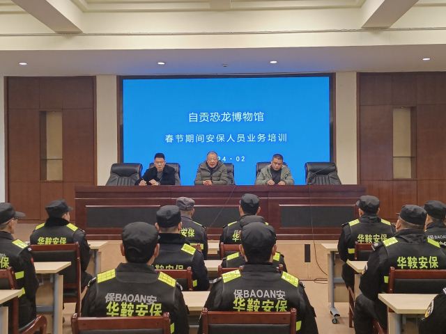 为确保自贡恐龙博物馆春节期间稳定有序正常运行,节日前恐龙博物馆周馆长召集保卫科领导和四川华鞍保安公司负责人召开安保会议,会上周馆长强调:春节期间各部门要进—步提高政治站位责任意识,明确安全责任,强化安全管理,守牢安全底线,必须把游客的安全放在首位,各出入口和各景点必须加强增加安保力量,特别是在安检处,要做到三查“逢包必查;逢液必查;逢嫌必查”。凡是违禁品、易燃品、管制刀具、打火机等禁止混入景区内,多措并举,谋动在前。提出“承恐龙传统,管一流景点,树景区形象,创一流品牌”服务宗旨,营造欢乐祥和的节日。